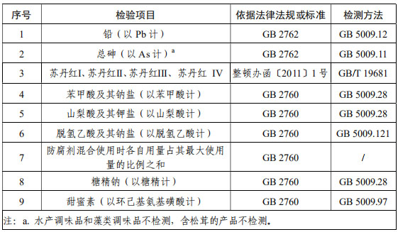GB 2760 食品安全國家標準 食品添加劑使用標準 GB 2762 食品安全國家標準 食品中污染物限量 GB 4789.2 食品安全國家標準 食品微生物學檢驗 菌落總數測定 GB 4789.3 食品安全國家標準 食品微生物學檢驗 大腸菌群計數 GB/T 4789.3-2003 食品衛生微生物學檢驗 大腸菌群測定 GB 5009.11 食品安全國家標準 食品中總砷及無機砷的測定 GB 5009.12 食品安全國家標準 食品中鉛的測定 GB 5009.28 食品安全國家標準 食品中苯甲酸、山梨酸和糖精鈉的測定 GB 5009.97 食品安全國家標準 食品中環己基氨基磺酸鈉的測定 GB 5009.121 食品安全國家標準 食品中脫氫乙酸的測定 GB/T 19681 食品中蘇丹紅染料的檢測方法 高效液相色譜法 SB/T 10371 雞精調味料 SB/T 10415 雞粉調味料